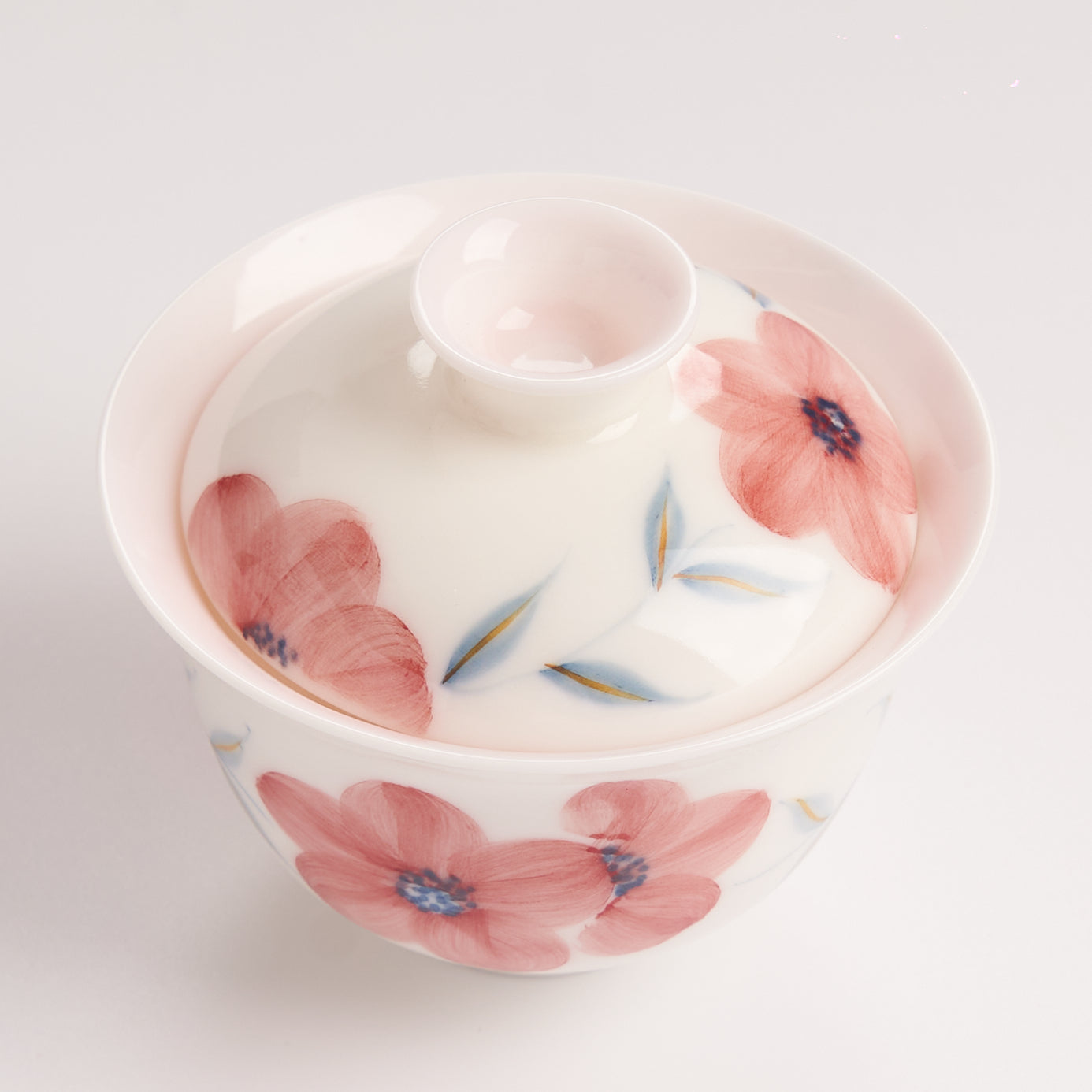 This gaiwan features a soft white porcelain body adorned with hand-painted peach blossoms and slender leaves. The brushwork feels light and translucent, with gentle color layering that gives the floral motifs a calm, refined presence.